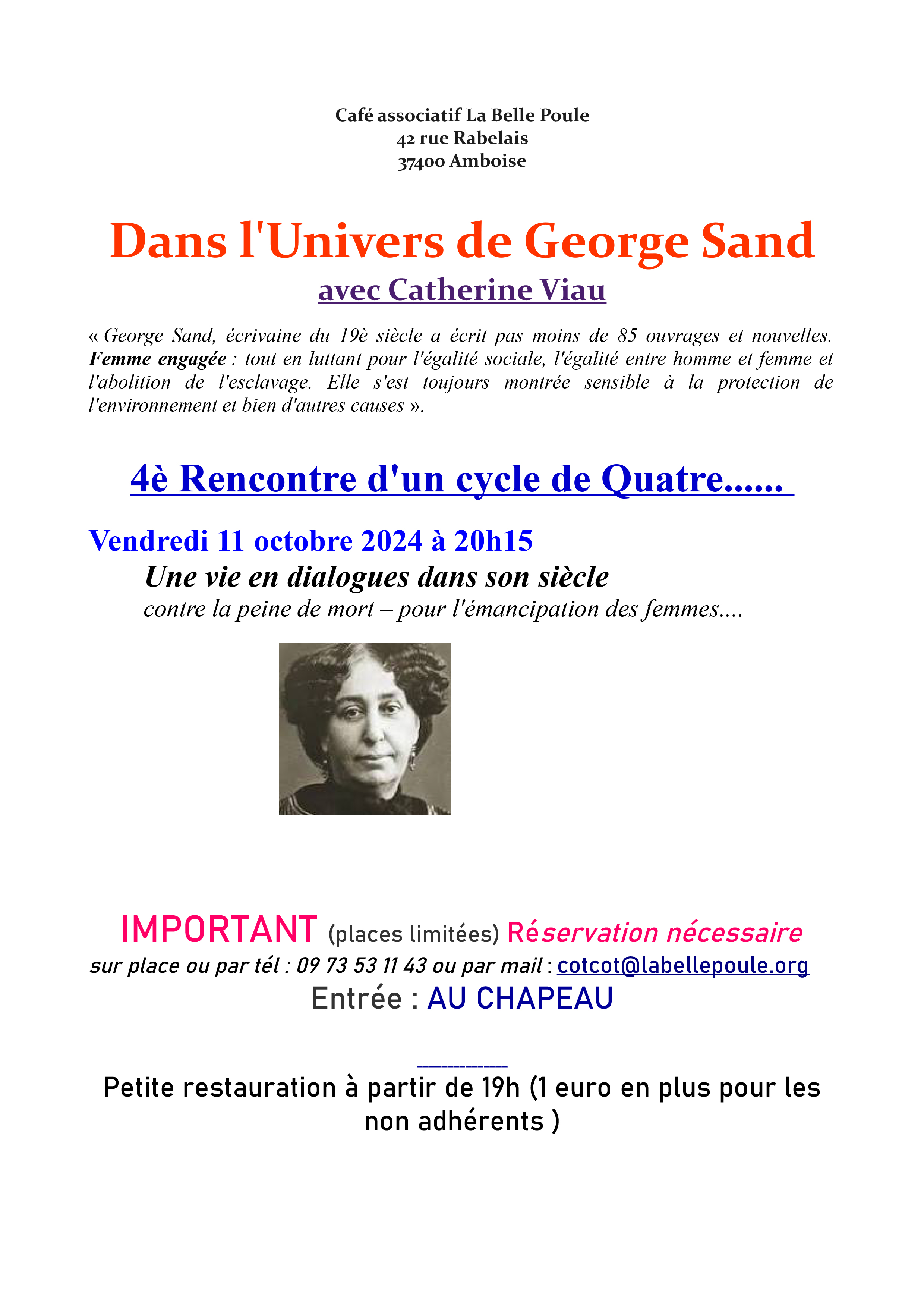 Le café associatif La Belle Poule vous donne le dernier rendez-vous du cycle "Dans l'univers de George Sand" avec Catherine Viau le vendredi 11 octobre à 20h15 pour aborder le thème "Une vie en dialogues dans son siècle" : contre la peine de mort - pour l'émancipation des femmes...