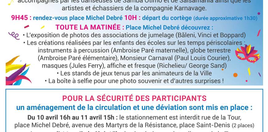 - Le samedi 11 avril, de 9h à 15h : la circulation est interdite : rue de la Tour, place Michel Debré, rue François 1er, rue Voltaire, avenue des Martyrs de la Résistance.