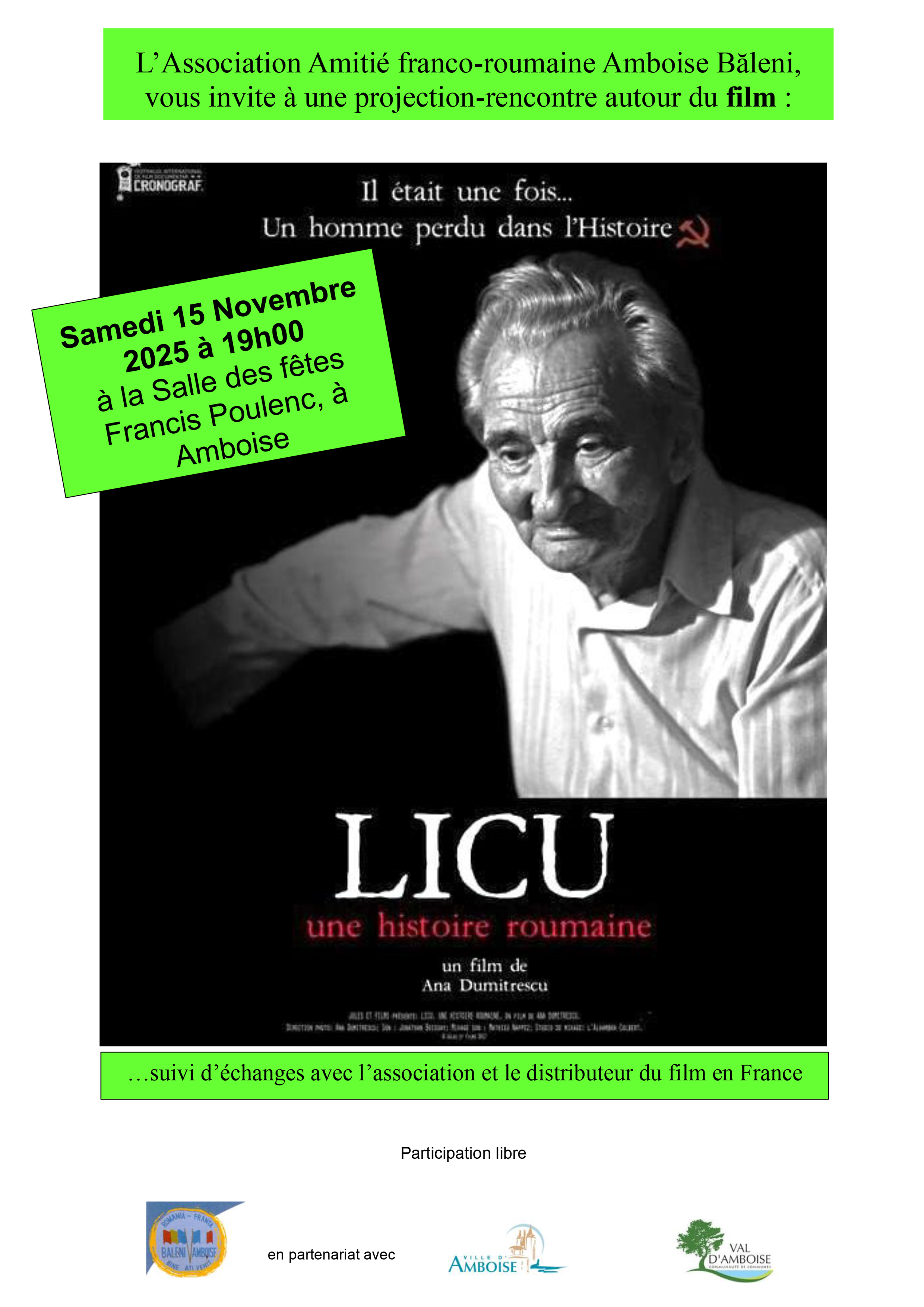 L’Association Amitié franco-roumaine Amboise Băleni, en partenariat avec la Ville d’Amboise et la Communauté de Communes du Val d'Amboise, organise la projection du film « Licu, une histoire roumaine » le samedi 15 novembre 2025 à 19h à la salle des fêtes Francis Poulenc.