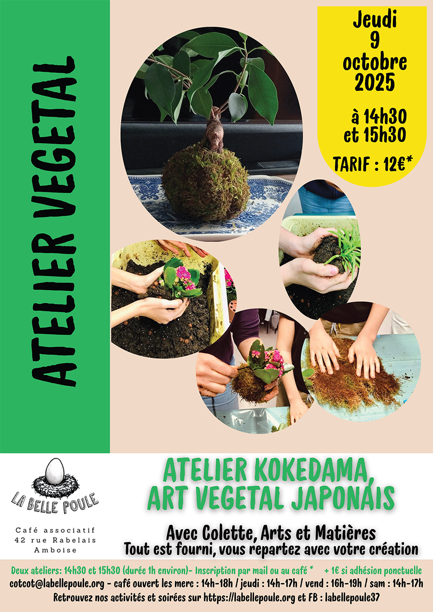 Le café associatif La Belle Poule vous donne rendez-vous pour un atelier d'art végétal japonais "Le kokedama", le jeudi 9 octobre à 14h30 et à 15h30.