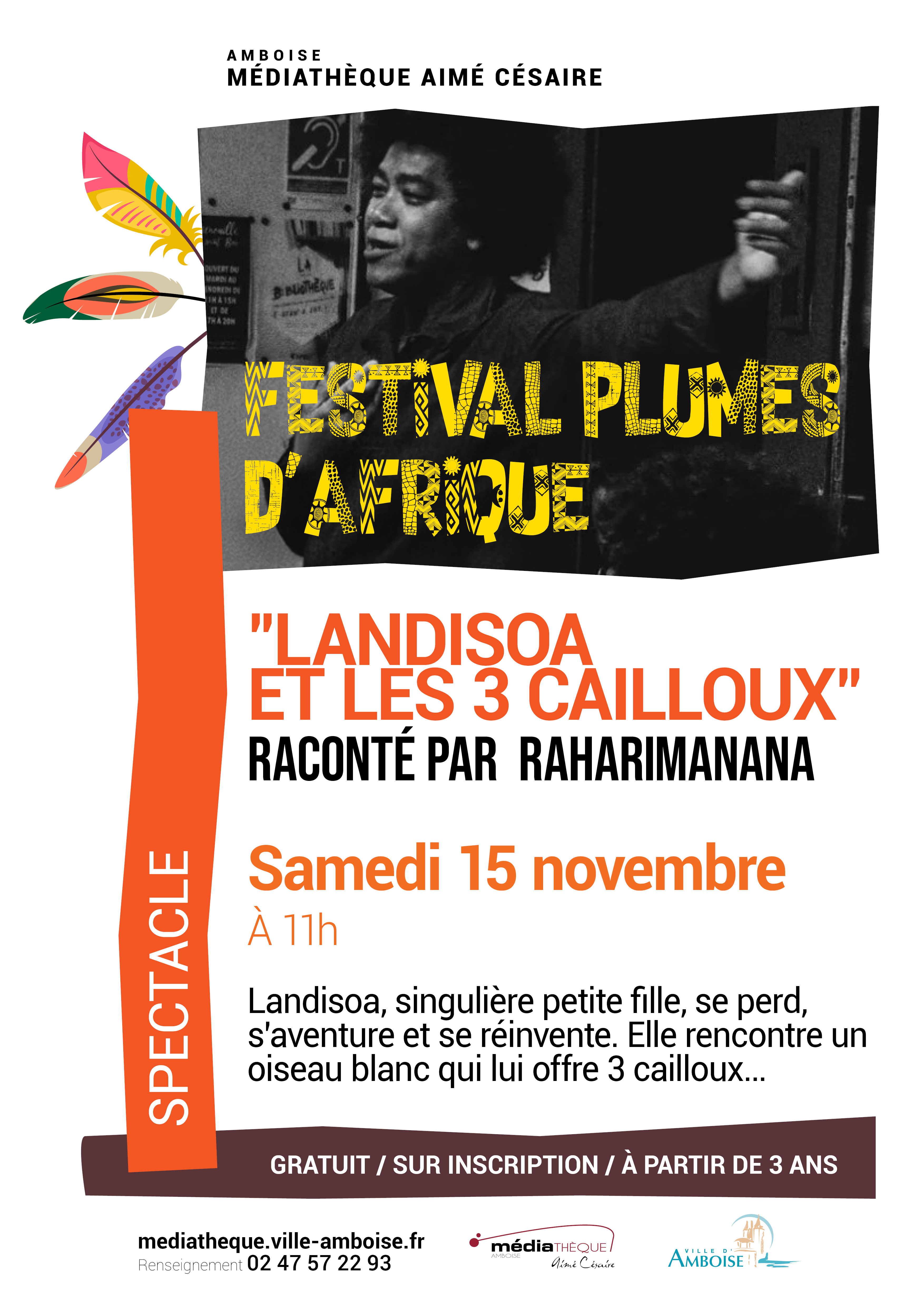 Dans le cadre du Festival Plumes d'Afrique, la Médiathèque Aimé Césaire d’Amboise vous propose un moment magique pour les enfants avec le spectacle « Landisoa et les 3 cailloux », samedi 15 novembre 2025 à 11h.