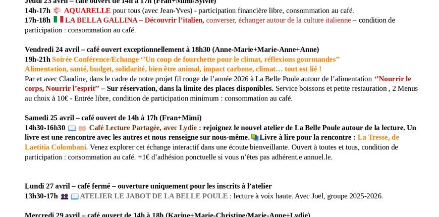 - Samedi 18 avril de 14h30 à 17h30, ouvert à tous