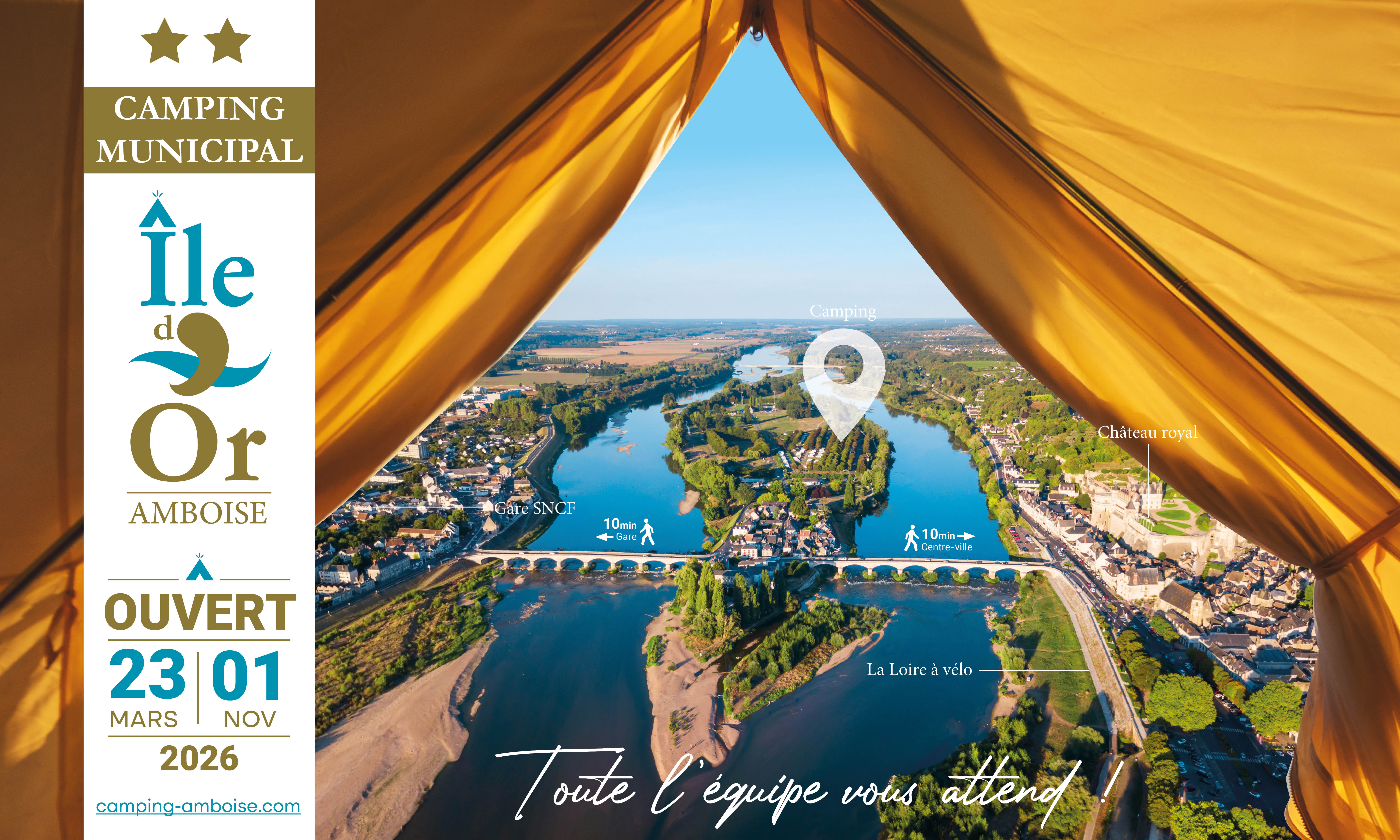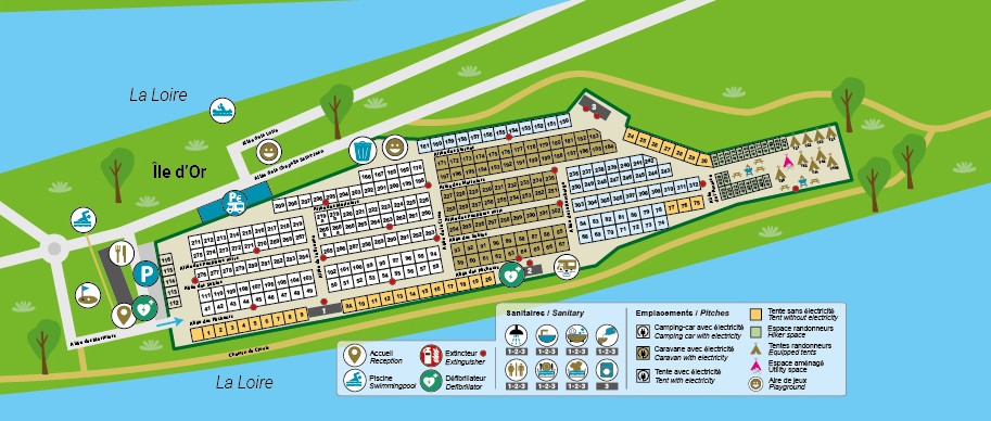 Le camping municipal de l’Île d’Or vous accueille du 23 mars au 1er novembre 2026. Réservez dès maintenant vos prochaines vacances ! Situé entre les deux bras de la Loire, à deux pas du centre-ville historique d’Amboise, sur le parcours de la Loire à vélo et au cœur des châteaux de la Loire, le camping de l’Île d’Or vous accueille dans un cadre exceptionnel où nature et histoire se sont conjuguées pour votre plaisir.
